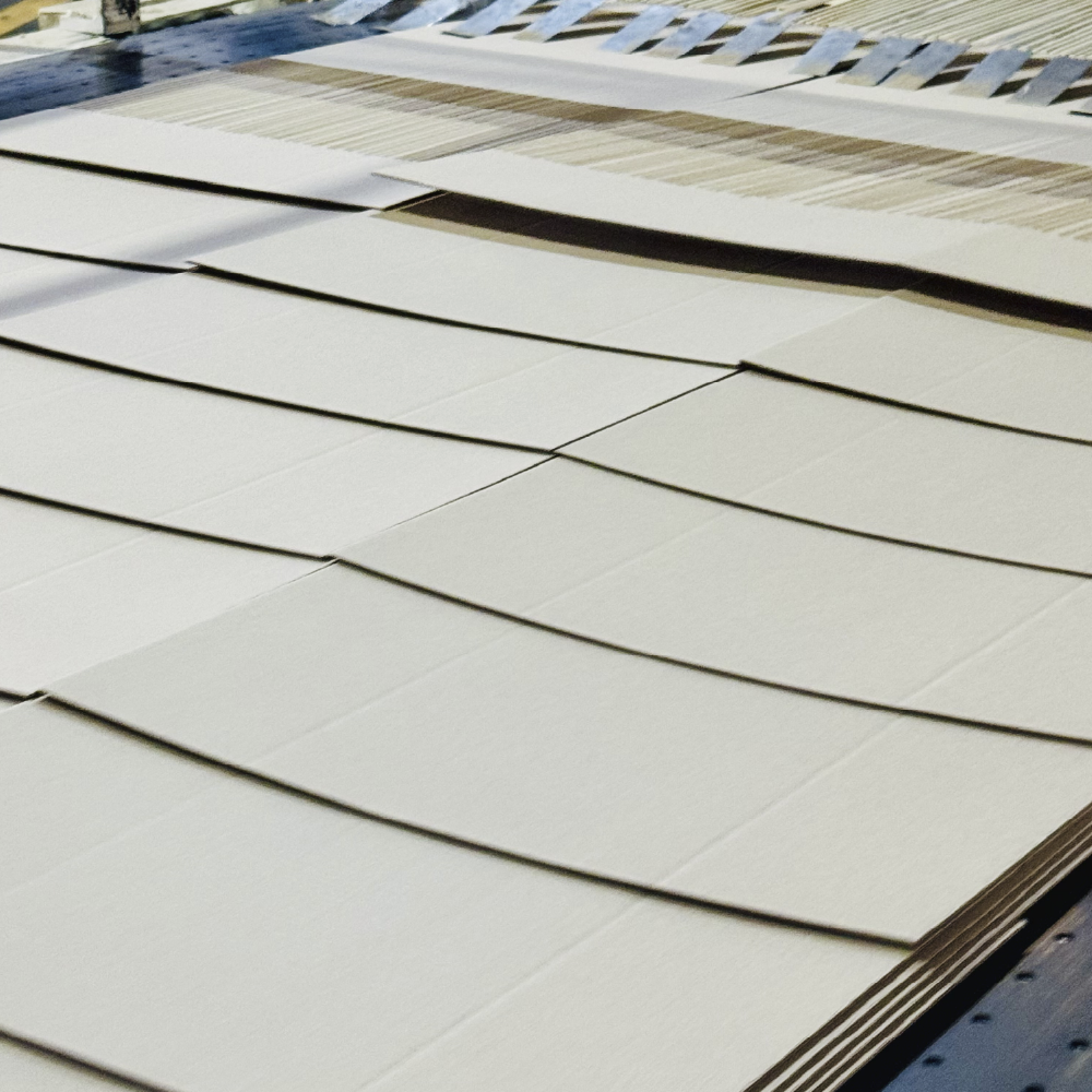 Mistura de refiles e aparas selecionadas com adição de corante para melhor aparência. É um material 100% reciclado e recomendado para utilização nas capas externas das chapas.